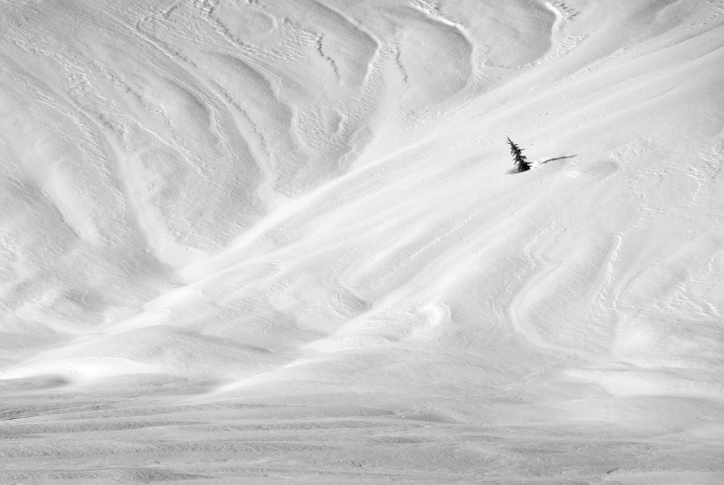 I really like the patterns in the snow and the tree, even though it is dark enough where you don't notice any detail, provides a place for the eye to stop. The curves in the snow patterns leads your right toward the tree. I would try lightening the image and crop off the bottom and some on the left.