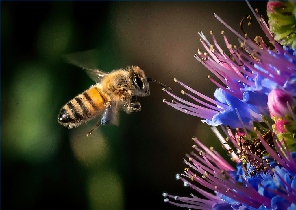 I like the sharpness that you have with the out of focus background. I was thinking that the brightness of the background green seemed to draw interest away from the bee. When I was checking to see about toning that down, I noticed that there was a lot of noise in the out of focus portions of the image. Here is with my suggestions. |