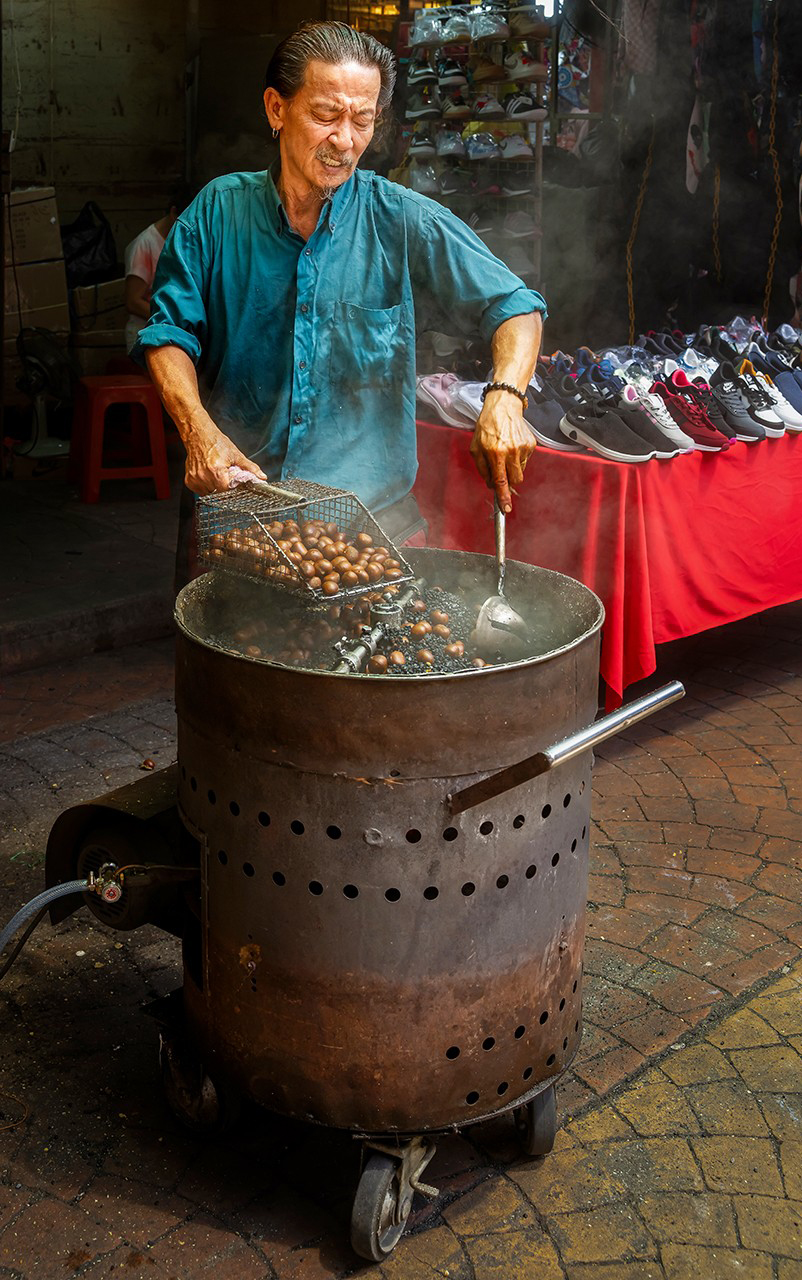 I like the way that the red cloth on the table contrast with the man's shirt. I might suggest cropping off the items on the left side. It might make for a better position for your subject in the image. He would be leading the eye back into the image since he his looking toward the center. |