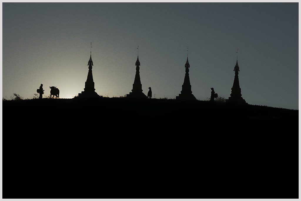 I do not see the problem you refer to since the sky looks to be an even gray. The subject matter is interesting and the silhouettes of three people, a water buffalo and the spires show well. Can I suggest that when you are showing such a black image you might think of adding a frame to help the image get defined. Something like this. |