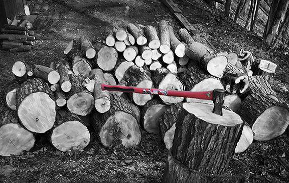 Since I'm on my desk top now these suggestions may not apply for our group but I think they could be done with the apps we use. So I cropped, converted to B&R and then revealed the red in the lower layer to keep the color of the axe handle.Just another was of looking at it. |