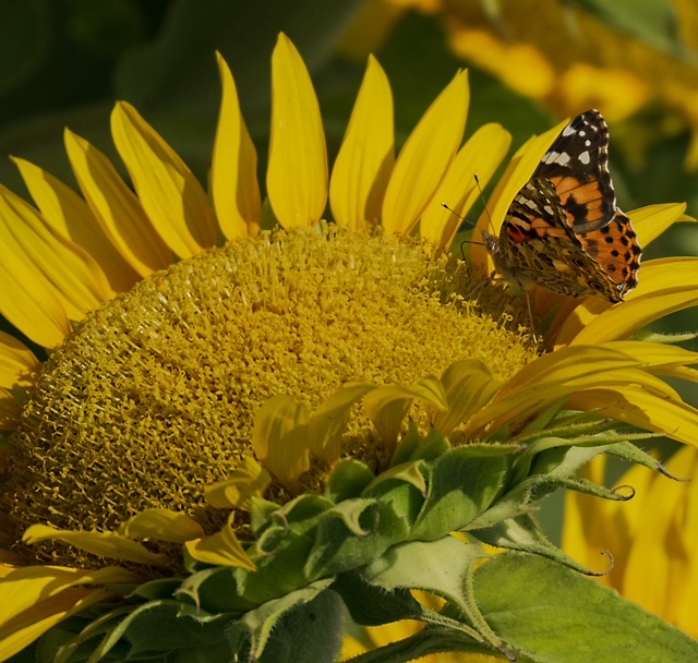 Since the butterfly is hanging upside down and the colors of its wings are similar to the sunflower, I'd suggest to rotate the image to give it another visual appearance. I am not sure if you agree with this approach. |