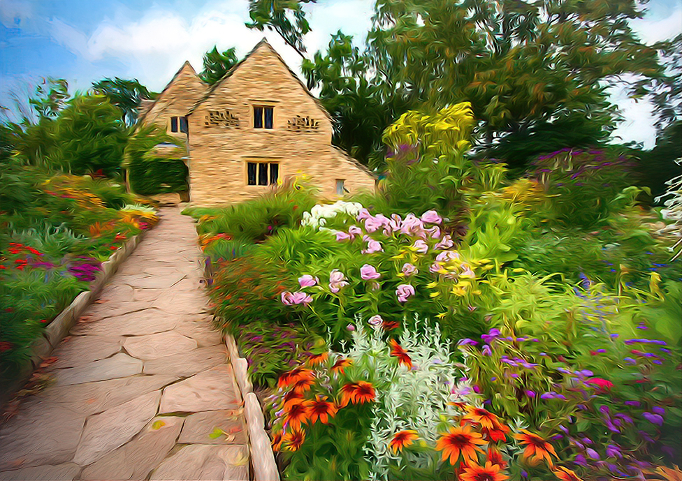 The painterly look really fits this image and the vivid flower colors create Impact. The house was canted left so I hit ctrl A ctrl T in Camera Raw to straiten it. As the others stated the left edge was burned to dark. I couldn't lighten that area so that it looked nature so I cropped the first gathering of red flowers out. That said I think it could be a wall hanger. |