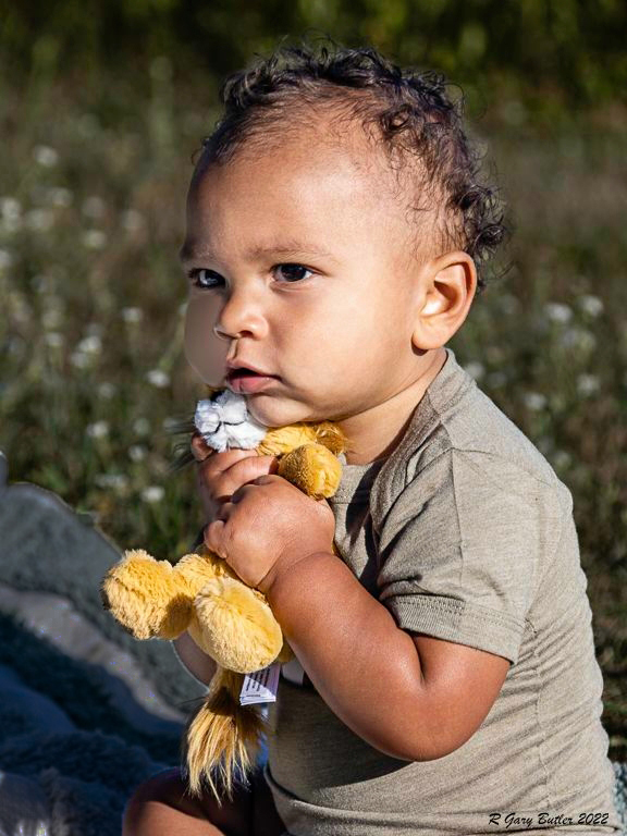 Congrats on your cute Grandson. You captured an interesting facial expression offering a soft background and good color. I agree that the blanket is a distraction. I used the Quick Selection Tool to create marching ants around the blanket then Image-adjustments-Brightness/Contrast, moved the slider to the left to the end. Still not dark enough for me. Used Burn Tool at about 50% to darken the white. |