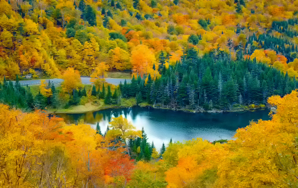 A Plesant view of Fall color and well balanced. I took the image into Bridge and used the Dehaze slider to +76 and that created more Impact for me. |
