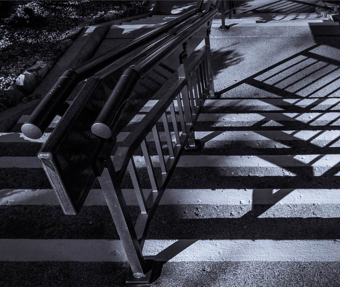 Bill, I like the railings and the shadow pattern on the steps, and I think you are right to present this as a strong black & white image. Compositionally, there are almost too many interesting things in the image, and I tried to play with various crops. However, I struggled to find something which satisfied me more. My best effort was to feature the railings more strongly at the expense of the top and some of the shadow at the right. |