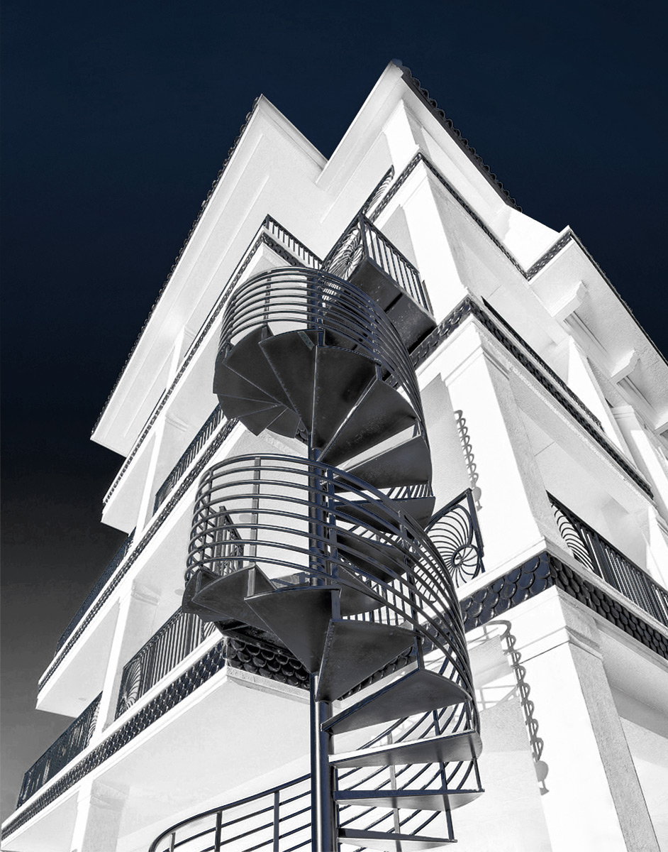 Gary, I really enjoy this sort of architecture. If I had been there you would have had to drag me away! I like your viewpoint which adds drama to the composition. I also think that Isaac's amount of sky and your further crop off the right impreove the composition. My great temptation with this type of image is to make it into a dramatic black & white. I took it into photoshop and applied a b/w adjustment layer. I pulled the cyan slider all the way to the left, and the blue slider most of the way. I also took the red and yellow sliders a long way to the right. This gave me the dramatic sky and building but took the detail out of the staircase so I did Select Color Range on the underside of the staircase (on the colour layer) and filled the selection with black on the b/w layer mask. This took the b/w conversion off the staircase. Then I applied a b/w layer overall, pulling up the blue and cyan sliders to lighten the staircase and railings and hold the detail. Obviously, this had no effect on the rest of the image. |