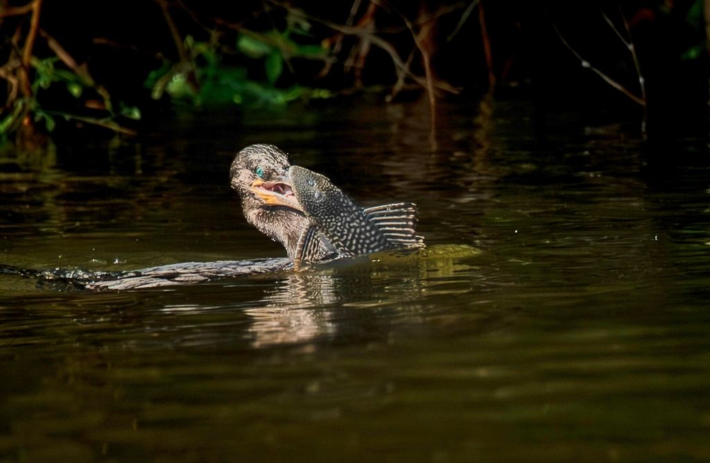 What an amazing shot to see the bird tackling a fish that size. It's a bit like a human trying to swallow a whole sheep in one go! I agree with the comments so far that it would be nice to have more light in the background. Good sharpness considering it was taken from a boat. |