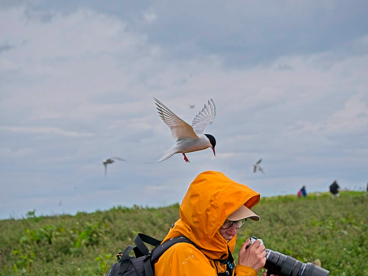 Ian, it was certainly very noisy! Also, there were Arctic Terns there and they would nest on the grass near the path. If you got too close to them, they would attack by pecking at your head. I used a walking pole stuck into my camera bag to stick up above my head so they could not fly over me. They would retaliate by aiming their droppings at you, so I wore a very old waterproof jacket as protection. It was fun keeping the camera protected! Here is a photo of Paula being attacked on Inner Farne, one of the adjacent islands. |