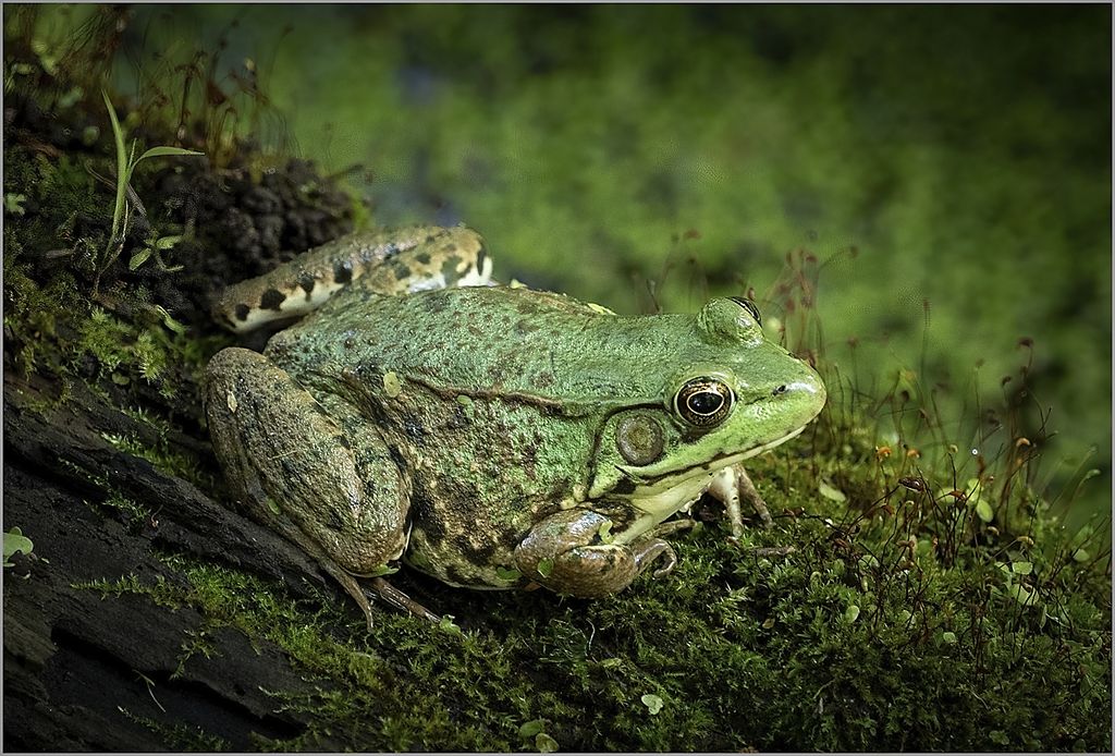 Bill, that was lucky you forgot to reset the camera because a single shot would almost certainly not have had enough depth of field. As it is, you have a very sharp frog with sharp foreground and a well out-of-focus background. Great shot. Just one very small point. As a pictorial image, that little bit of orange/brown grass under Kermit's right foot is a bit distracting. Could you change it to green along with a very small bit upper left? I don't know if it would be allowed in a nature competition, but it would help in Open or Pictorial. |