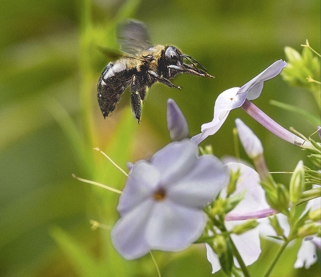 Well caught, Vella. You grabbed a great opportunity and got the bee sharp. I thought the big white out-of-focus bloom in the foreground was overpowering the image so I took it into ON1 RAW and toned it down. I also brightened up the bee and the background a little. I left the sharp white flower alone as the bloom the bee was aiming for. All done very quickly so not perfect I'm afraid. |