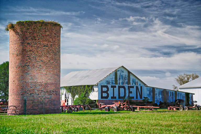 Good eye to find THE Biden's barn (grin). I'm wondering why you chose a wide open aperture for a scene like this. The farm implements in front are not sharp. I took the liberty of playing with this a bit and brightened the barn and silo and darkened and reduced the exposure in the sky a bit. If you think it is worth the effort, I recommend you clone out the other structure to the right. |