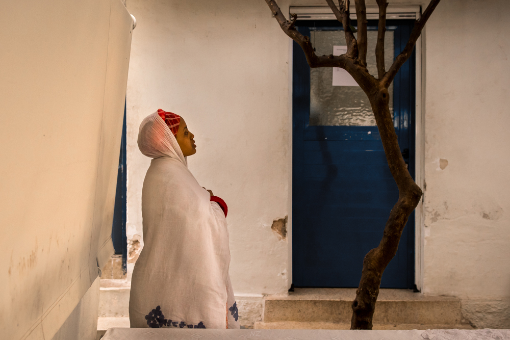 Excellent job of capturing the moment. The warm colors look great. But, I think that you have too many elements in the image, with the woman, the tree, and the blue door. I used the color picker in hues and saturation to reduce the saturation and lightness of the blue door, to tone it down -- what do you think? |