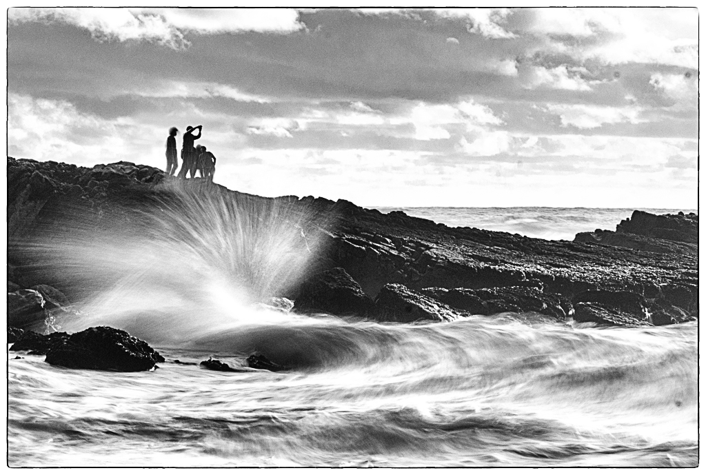 Tony, good job of capturing the wave -- I would not have thought of using a slower shutter speed to capture a wave. But then, in Oklahoma we do not get chances to capture waves! I like your conversion to B&W and your cropping in and turning the people. The image seems a bit flat to me -- I would increase the contrast some as I did with curves. |