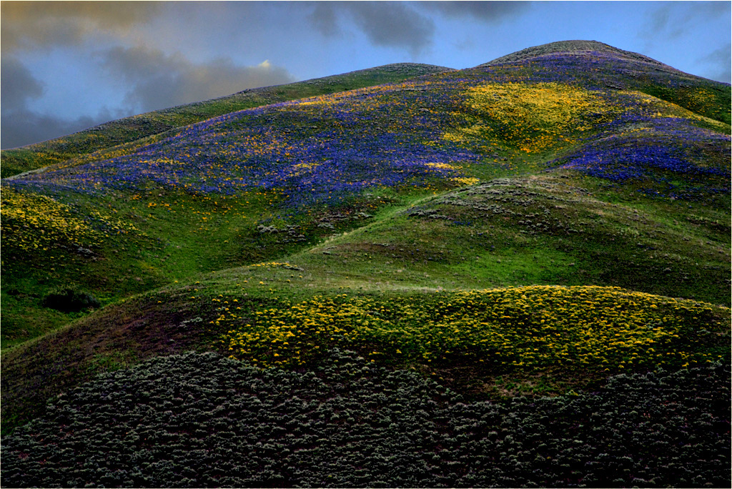 A nice colorful image that showed the natural beauty of he area. You captured it very well. I like the transition from dark at the bottom to the bright sky. I would flip the image. The mountain ridges are strong lead in lines, and my eye has a main center of interest with the large patch of yellow that would be at the upper right. |