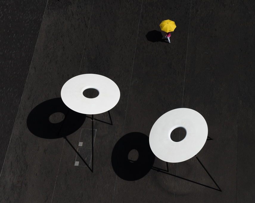 Great simple image, using the rule of 3. The yellow umbrella is placed very in the image. I simplified it a bit more, and cropped off the shadow area on the right side, and also got rid of the 2 small squares on the right. |