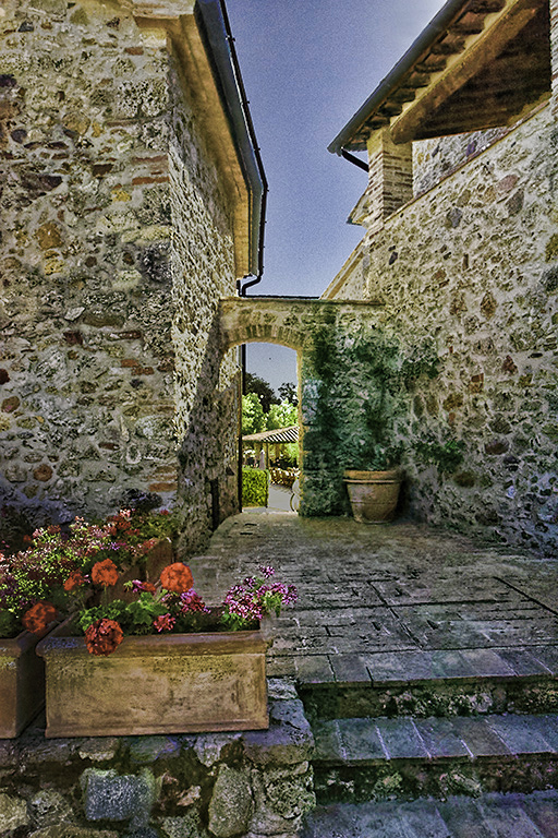 Very nice composition, with the open doorway for the eye to go into. You handled the high ISO very well. I do agree with Barbara to tone down the flowers in the lower left. The 3 orange small flowers by the doorway really draw my eye. I would clone them out. I used Topaz Adjust 5, with the vibrance preset to bring out the detail in the walls. Also made suggestions above. |