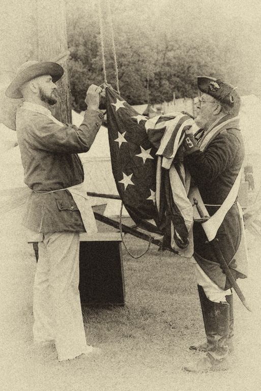Nice image of the flag raising. It is good to see that the men were in total period dress. The white tents do not bother me, but I would crop the white sky off the top ans Barbara suggests. Why not go with an old monochrome, to make it look like it was taken a long time ago? I used NIK Silver Effects to do this. |