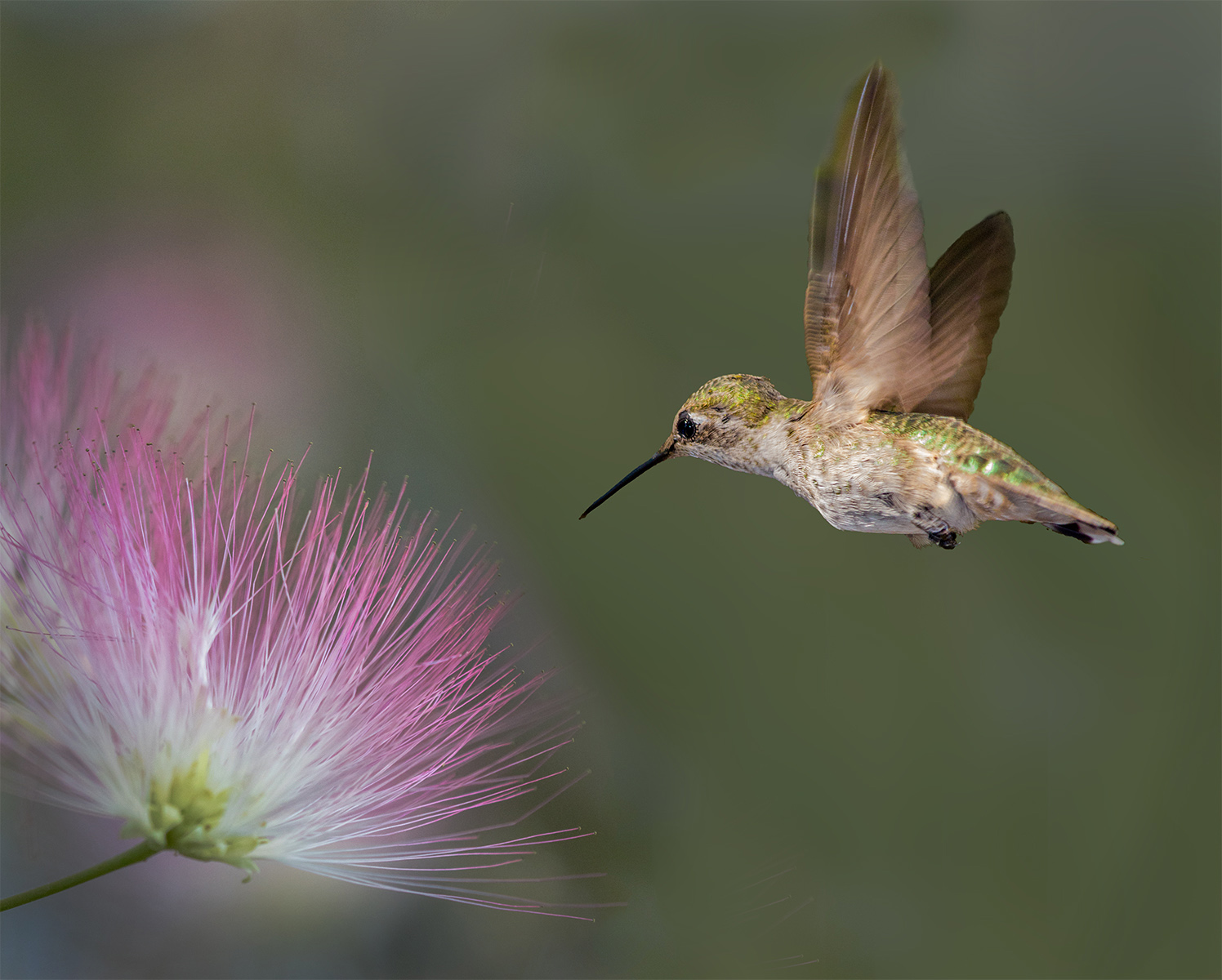 Great image, with the hummingbird's eye super sharp, but wings slightly blurred, showing movement and life. Excellent job of combining the two images. To me, the flower is too light, and its brightness draws from the bird. |
