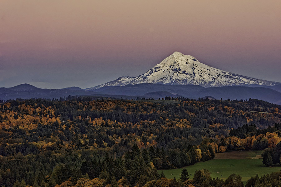 I really like the image, but it looks flat to me. I would not crop it -- the mountain needs a base, and the fall foliage is good. I used Topaz adjust 5 with the vibrance preset. It overdid the sky, so I used a mask to keep the effect off of it, and the 75% opacity on the whole image. |