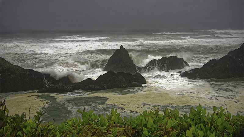 Being centered is fine with me. This is a nice layered look with the foliage, rocks, water and sky. You captured the wave action very well. To me, the image is a bit dark. I left the sky dark, but lightened the rest a bit. |