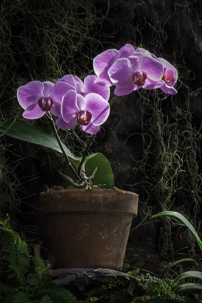 Really nice image. The flowers are sharp and the background i good. I would darken the spanish moss some, and get rid of the brown string hanging down from the left side of the pot. |