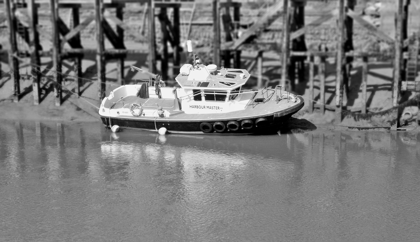 The boat stands out better in color. The background shows how much the tide is out. A suggestion would be to select the boat and then slightly blur the background. I did a quick selection of the boat and it look like it! However, maybe it will give you an idea. A selection of the color image would work better than using the mono like I did. |