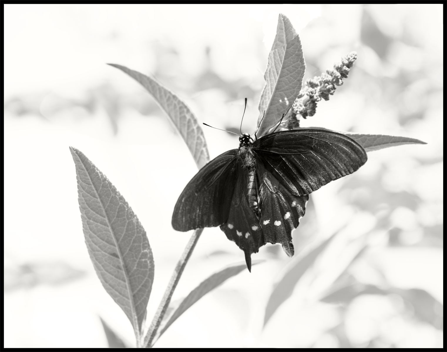 The butterfly is very sharp, with a great blurred background. I like the leaves in the image, and the sharpness of them. Conversion to B&W is a good way to simplify an image and get rid of too much color in a background. A suggestion would be to flip the image, which to me puts the butterfly into a better position and also lets the stem become a lead-in. |