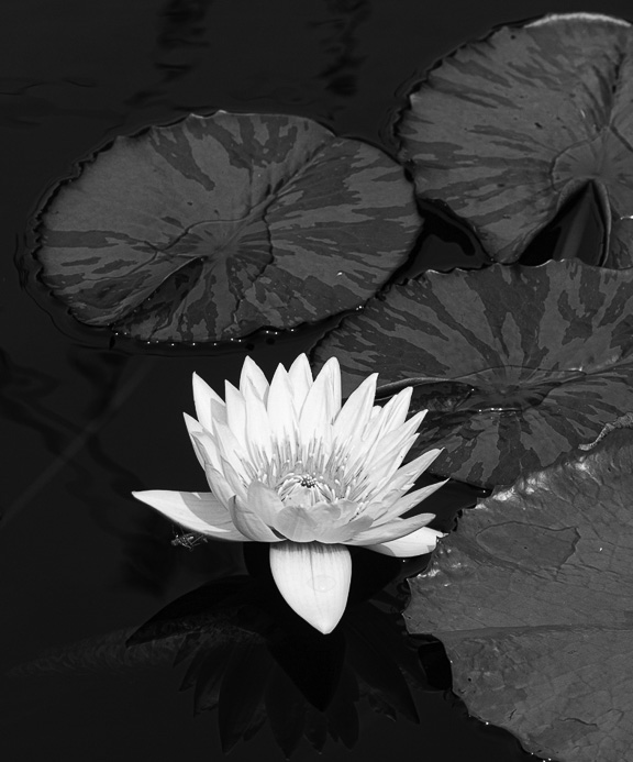 The lily pads have a really nice pattern to them. You have a good reflection of the lily below it, which is adding to the image. I am not familiar with water lilies, but it looks like you might have lost some detail in the flower (if water lilies have detail in the petals.) The flower appears blue on my monitor, and when I converted to grey scale, the blue goes away. |