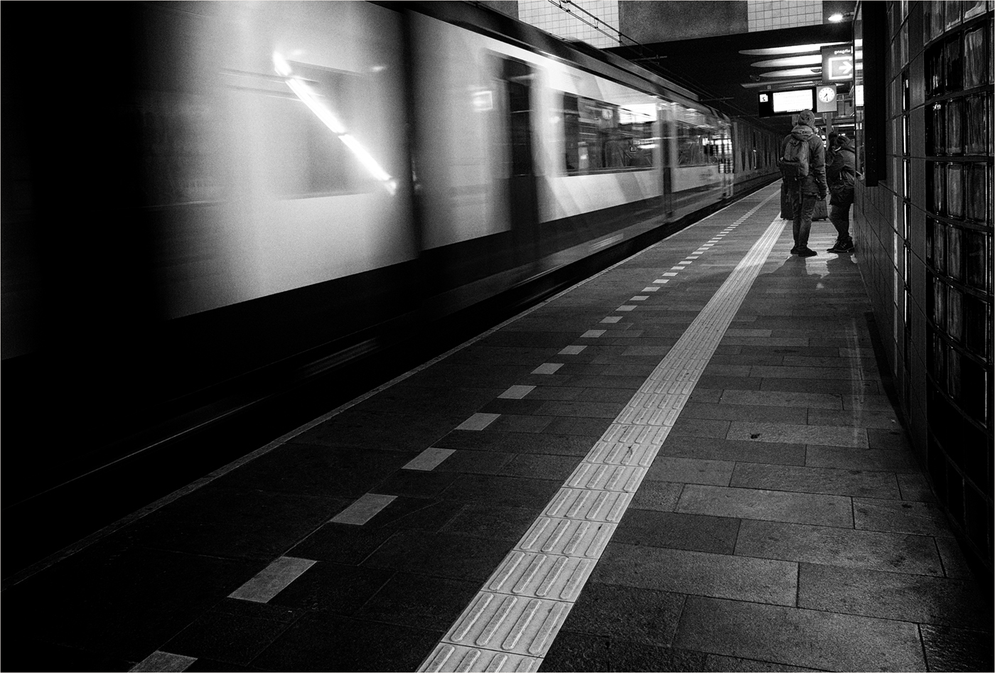 An interesting image, and I like the monochrome better. The people standing around add a lot to the image. I would crop off from the left to get rid of the dark area in the corner and the moving woman. To me, that would make the woman standing and looking at the train a point of interest. And I do agree with Stephen that I can not tell by looking at the image that it was taken in a cafe, if that is what you wanted. |