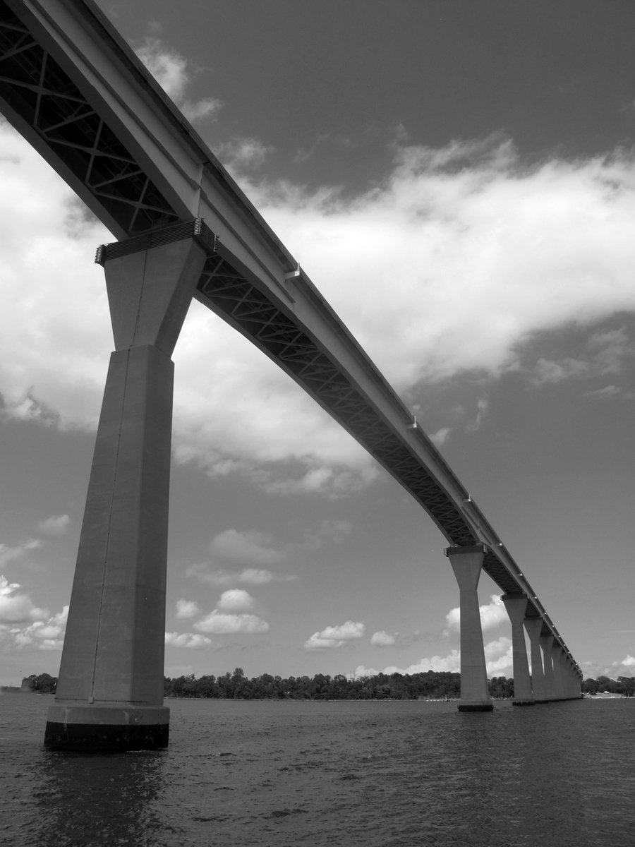 Excellent example of a "vanishing point" image. I really like the angle of the bridge and it that shows how high that it is. I would remove the thin poles above the bridge and the white area at the waterline on the far left. I like the tone of your original image better that your second image. |
