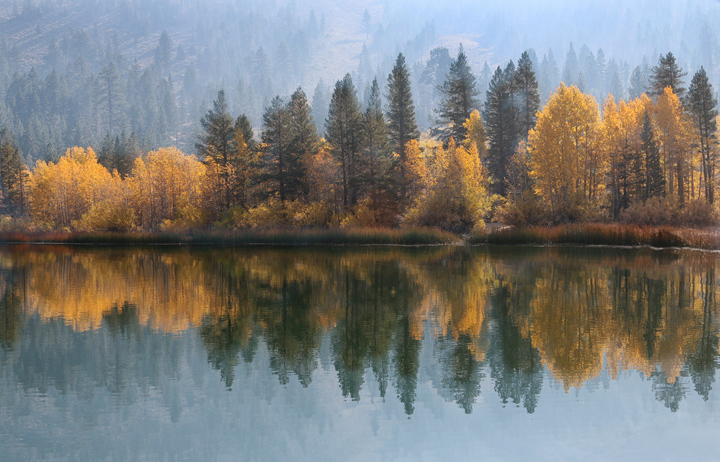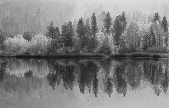 What a great landscape image with the reflections. I would not crop it any. I think that the monochrome is fine as it is, and the color is also very good. I think that the monochrome has really good contrast.If you want to show more smoke, us the de-haze filter in camera raw, just move the slider to add haze instead of taking it away. I did that with your image, but first duplicated the image so that I could use a mask to bring back the full color in the close trees and reflections. Then I also did a conversion to monochrome. |