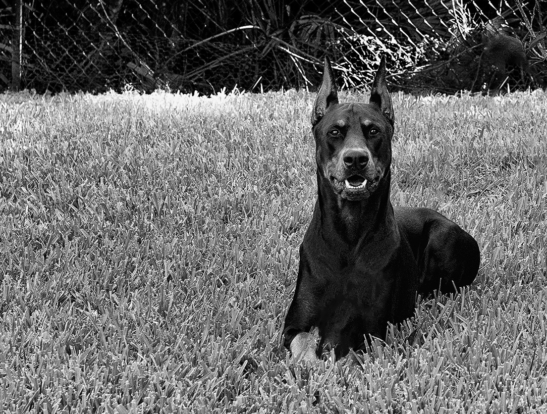I had the same problem with taking photos of my Westies, when I tried to take their photo they ran toward me. First let me saw, what a good looking dog. I like the catch lights in the eyes. I agree that the fence is bad. You should have gotten just a bit higher to take the fence out of your shot. I did a quick selection on the frisbee,and then in Content Aware Fill, used only the body of the dog to fill in the frisbee. I cleaned up the area left by the selection and also removed the branches on the right side. |