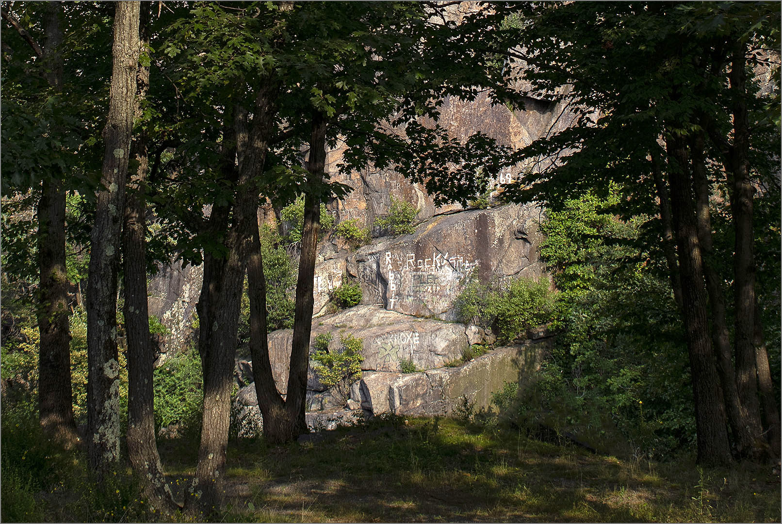 The image is sharp, even cropped in. The graffiti on the rocks is what makes this image. You are fortunate to have such a photographic area close to your house. I would get rid of the distracting dead tree branches in the lower right, and make the image a bit brighter. |