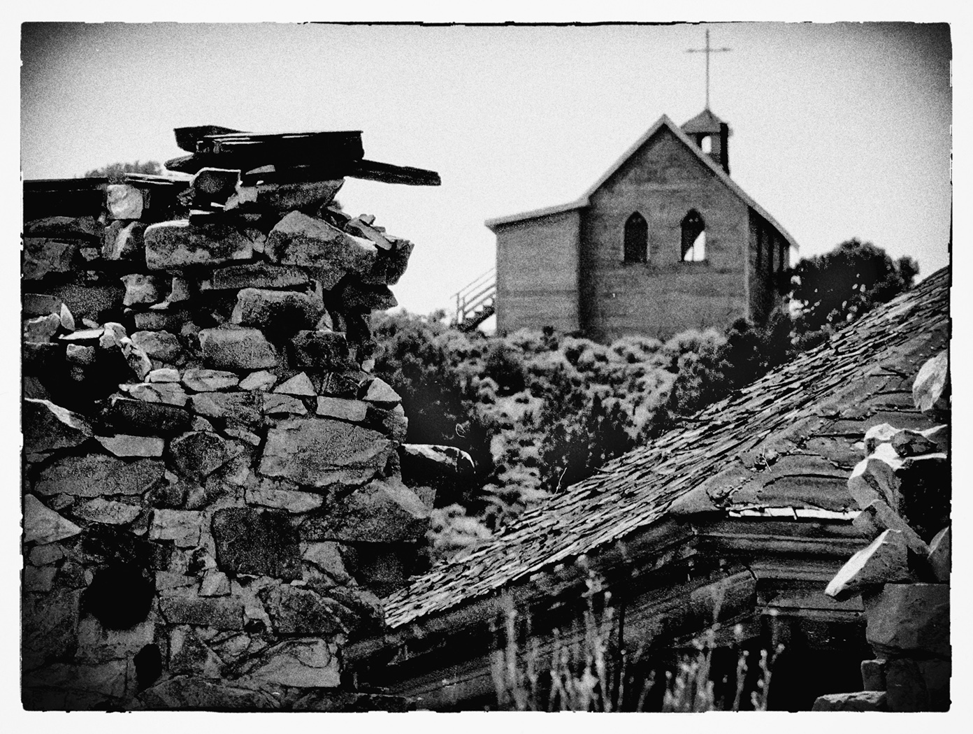 Lots of ruins, but of course the church is the main subject. You improved on the original image a lot with the grain, vignette and boarder. Since I think that the church is the main subject, why not reverse the image and put it into the upper right? That also allows the slanting roof to draw the eye to the church. |