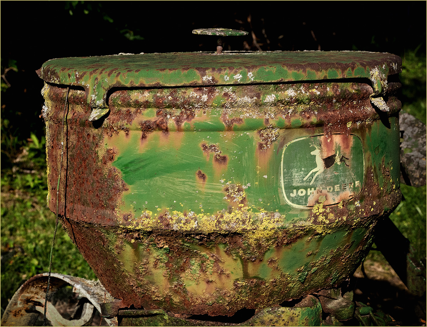 I cropped in on the whole item, and used NIK Color Effects and the Vintage Saturation preset. I cleaned up the stem coming in on the right, and desaturated and darken the yellow wheel in the lower left. |