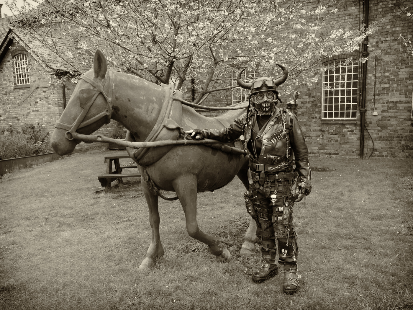 You captured a very interesting character. He certainly has a lot of punk items on him, and your image shows all the detail. I like the background, and no, I do not think that the horse is too gray. Unlike Wes, I like the mono better; it shows all of the detail without distracting colors. |