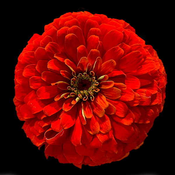 How nice of your daughter, the flower is in perfect shape. Straight on gives you great depth of field. The zinnia is very colorful and bright, but the white background is too much. I used the new Object selection tool in Photoshop and changed the background to black. |