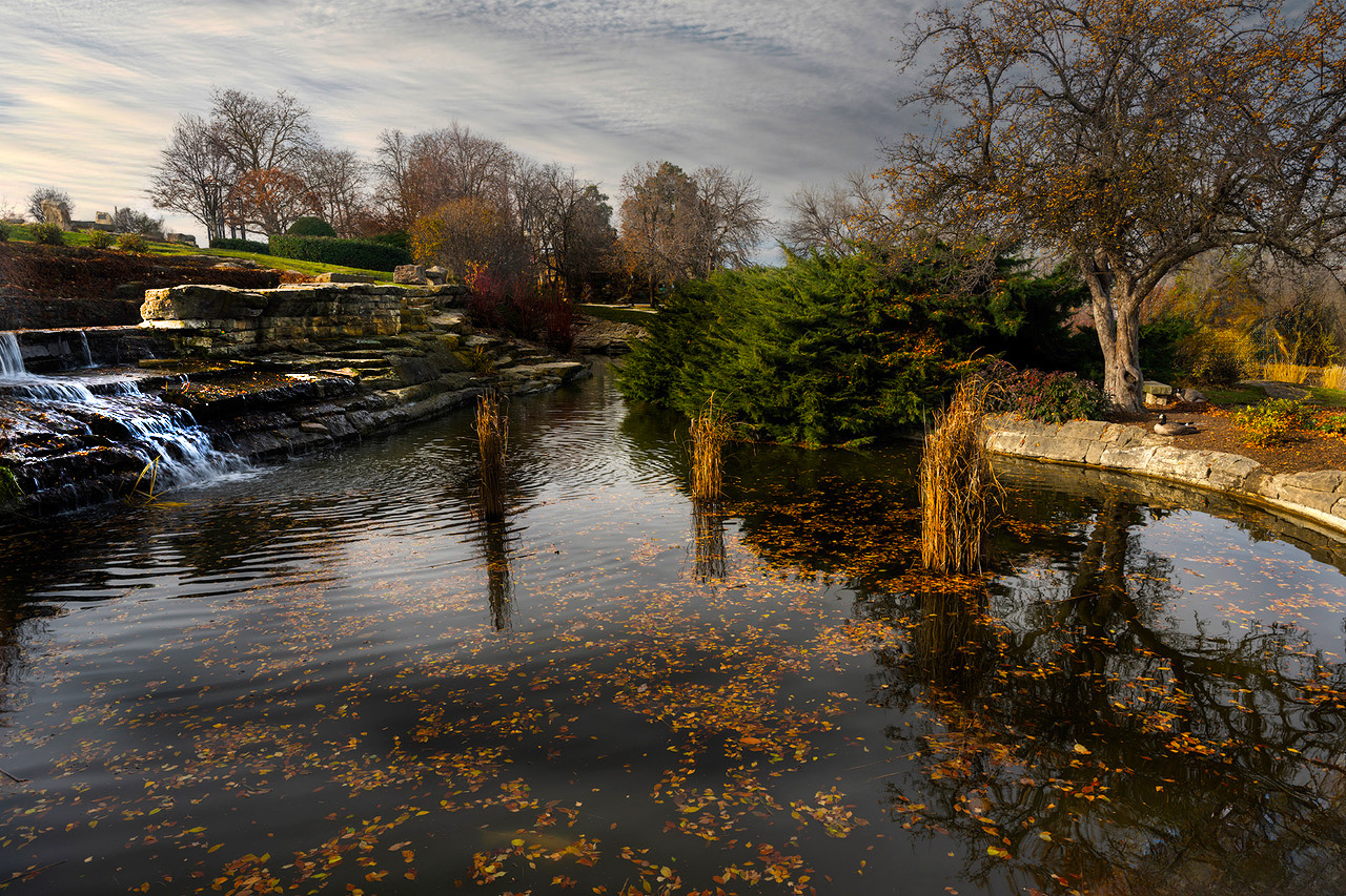 What a beautiful location, and the fall leafs in the water add a lot to the image. The sky and the lighting are good. I did some editing in Photoshop, to lighten the wall area on the left, to add some more saturation to bring out more of the fall colors, and some cleanup to remove the lamp post, remove the picnic tables in the center at the end of the pond, and the building on the right. The image is very good, but I think that it could be improved on. |