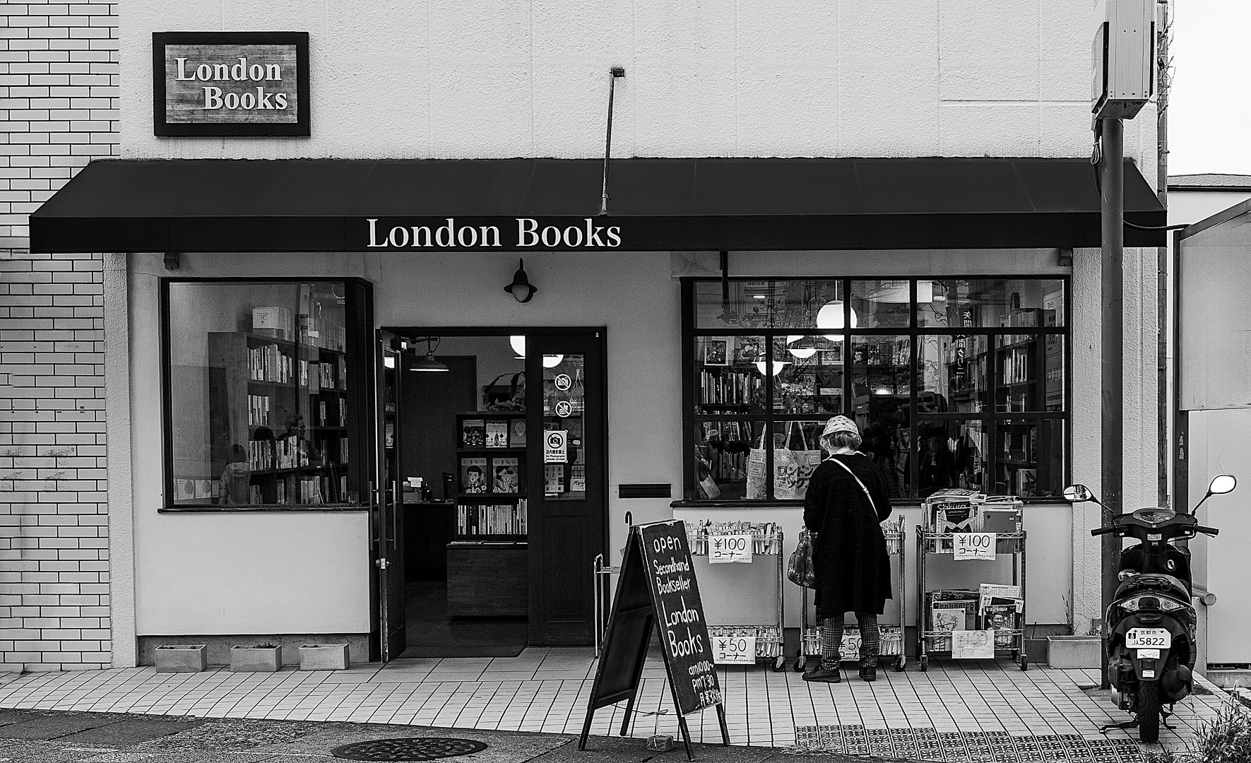Your crop is very good, and really improves the image. Your conversion to mono is also very good. The woman adds to the image but it would be also be good without her. The prices in yen and the signs in English adds to the interest. I used the remove tool in Photoshop to get rid of the lettering on the far right and the partial black area on the far left. What do you think? |