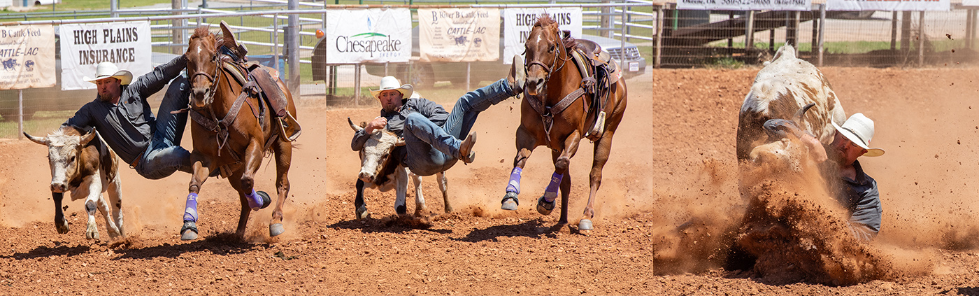 You captured a good action shot at a peak of action. The image is very sharp, but there is still some motion in the calf's leg. The background is great, and is really hard to do in rodeo images. When I saw bulldoging, the cowboy does not throw his leg over the calf, but grabs the back and horns of the calf and pulls it down. The image that you further edited is a big improvement.