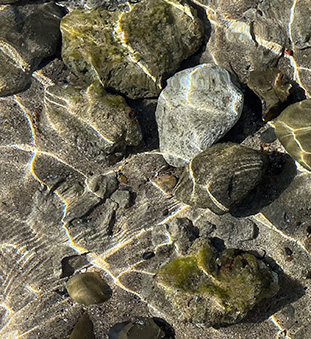 What a great photographer eye to have noticed this image. The reflections from small ripples in the very clear water are very interesting. There is a lot going on in the image which makes it kind of busy. I like idea that Cindy had of cropping in on the image. There are several possibilities, but I chose the lower left. I like the larger light grey rock as a focal point and the ripples making a lead-in. |