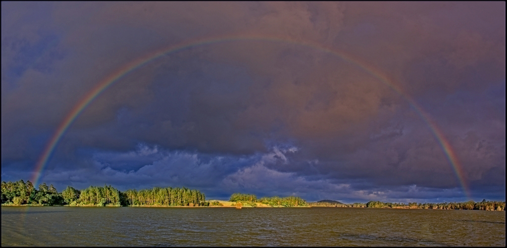 Wow, great thinking to take 2 images to make a panorama showing both ends of the rainbow. You put the images together very well. Your exposure was excellent to show both the sunlit trees on the far bank and the rainbow. To me, the image seems a bit green. I did adjust the color to what I think looks better, but it may not be accurate to the actual scene. |