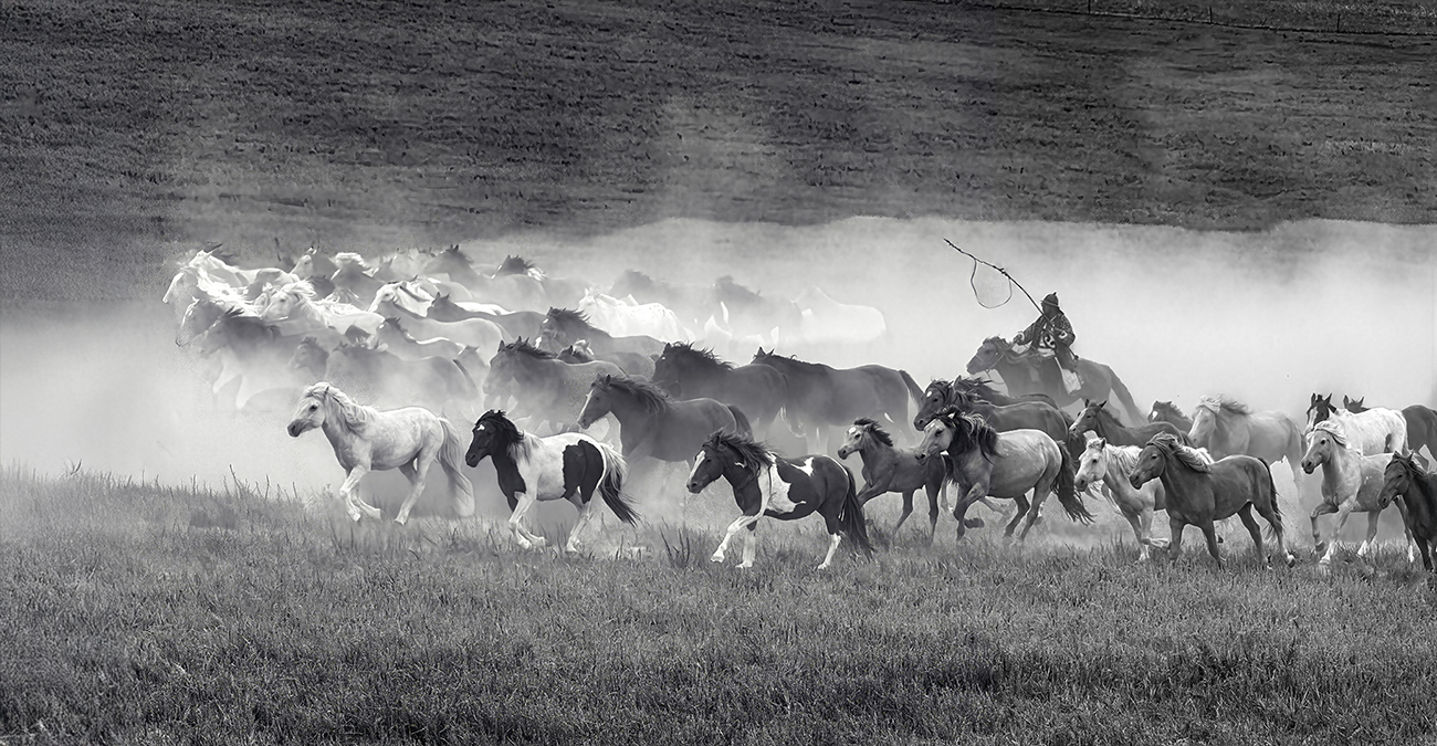 Really great shot with all of the dust, a large number of horses and the lone rider. What a great sight that must have been. The horses in the front are very sharp and of course the horses behind them fade into the dust. Mono is fine and does simplify the image. I did use generative fill to add more space in front of the horses, reverse the image to have the horses run into the image, and got rid of the small part of the last white horse. I am not sure how PSA is considering generative fill. A harder alternative would be to expand the canvas and use the clone tool to copy pixels in the image in front of the horses. |