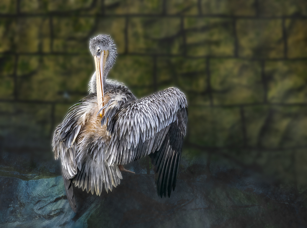 I disagree with Hoshedar, the background is what makes this image. The blue and green colors on the background are great, and the rocks have a lot of contrast. The pelican does look good and the small feather adds to the image. As an idea, I blurred the green stones behind the bird, to add separation. I know that there is a halo around the pelican, so not a finished image, but again, showing an idea. |