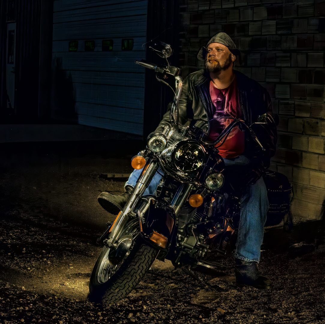 What a great story and image. You really captured the biker and his bike very well. I have tried some light painting of a setup in my house but never outside. I do need to try it! I like the image as is, but to improve it I would get rid of the small green area in the upper left (it seems to draw my eye). I would also crop off the right side to get rid of the lighted top area, and try to bring back more detail in the headlight. Too bad that the club judge did not like the image, their mistake. |