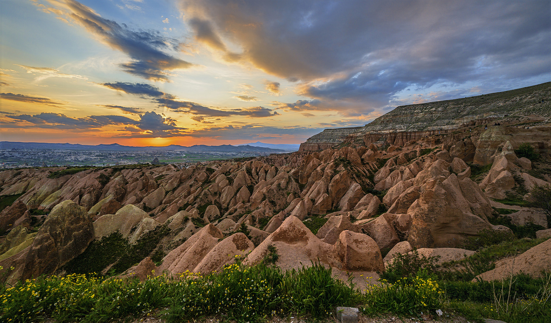 Ilike butches rendition. I thought that I would select the bottom half including the sun and orange plus sun and grey in that stripe. I am not as accomplished with photoshop so I would then add midtone contrast to that. That way the sun and hills would have more pop. |