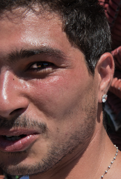 You captured the good face expression of worker. It is regret that you too close and use 44mm length, so worker's face has some distortion. As you say he has a fantastic earring, so I would keep the original color image, because he has a nice suntan color and the fantastic earring will more pop up. Since his face has little distortion so I would crop off the left side of face and right side extra part.