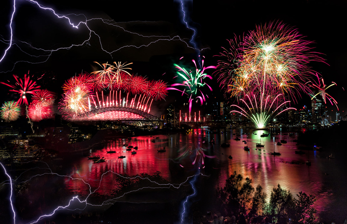Very colorful celebration image with fireworks. I think if you want to add the lightning reflection to the fireworks image, it would be difficult to get more reality. Since the fireworks and their reflections are very bright, the lightning reflection might not be shown visible. I try to add it on, in your case the lightning reflection only few part fell in the water area. Or you might try to move the lightning location where their reflection can fall in water area, then use "Motion blur" to made it little blur and see how they came out.