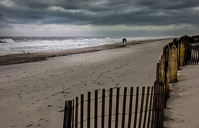Very nice shot, I like your composition. I agree Tom's comments darken the bright area can bring out more detail on the waves and match your title. The fence is leading us to the end of beach. The couple is really help your image to match with your title. The only thing I would try to move the couple farther, so they can with the fence together are leading us looking further to beach end. |